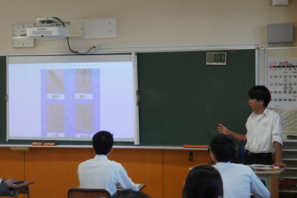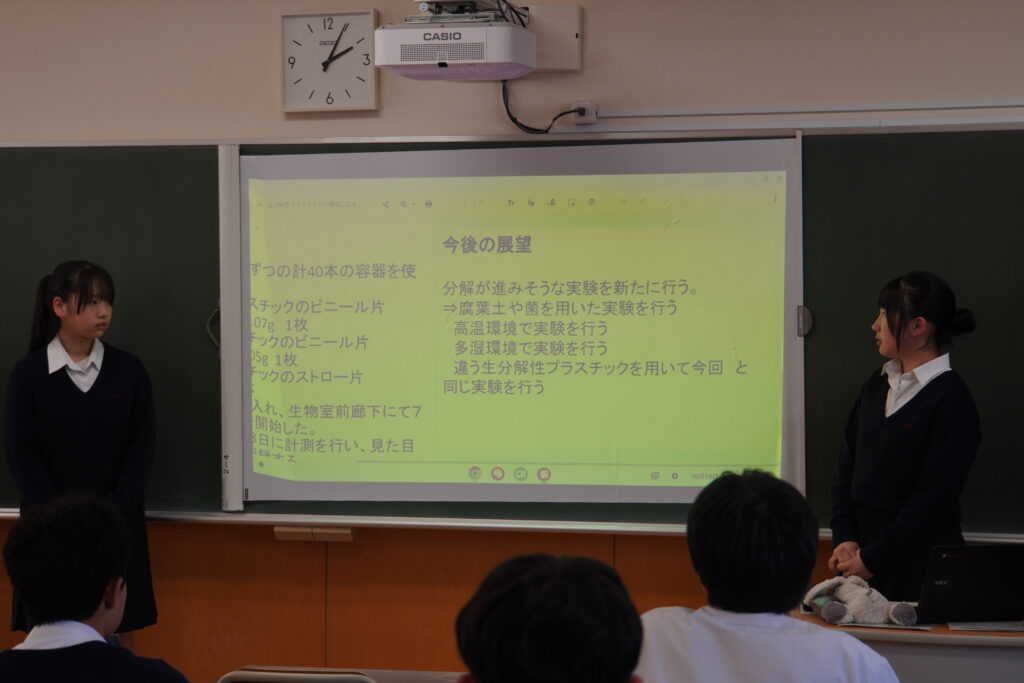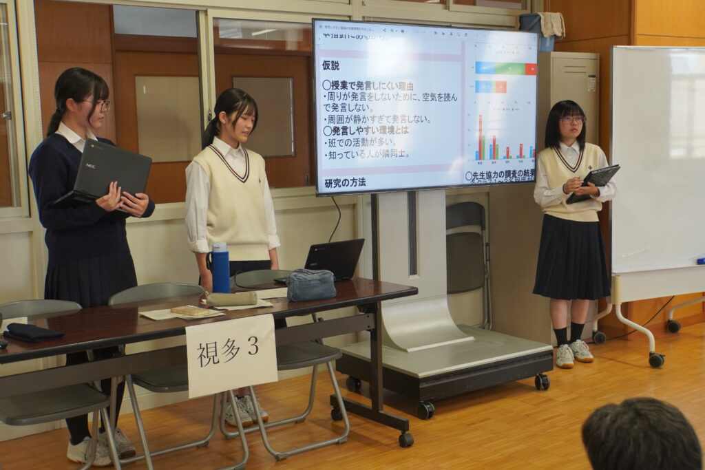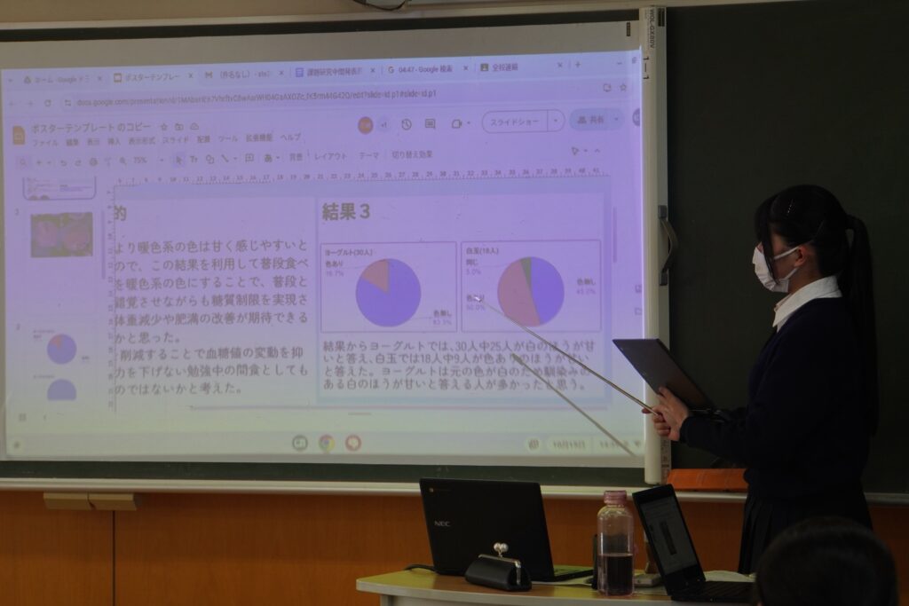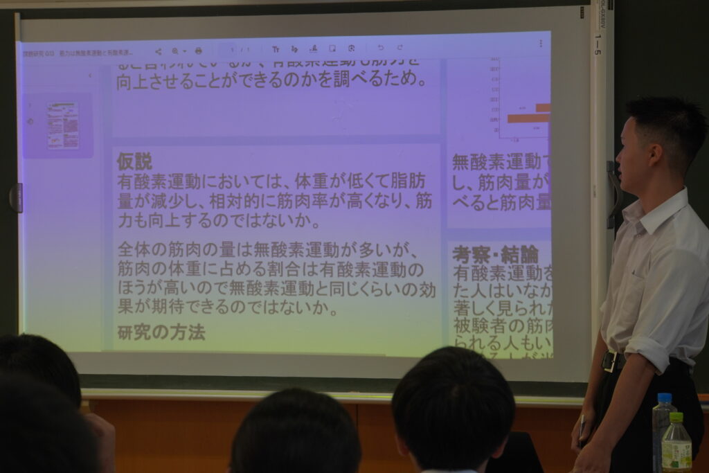 課題研究中間発表会が行われ、2年次生が4月から取り組んできた研究のこれまでの成果を発表し、多くの方々に参観いただきました。伝わりやすく工夫が見られた班が多かったように思います。